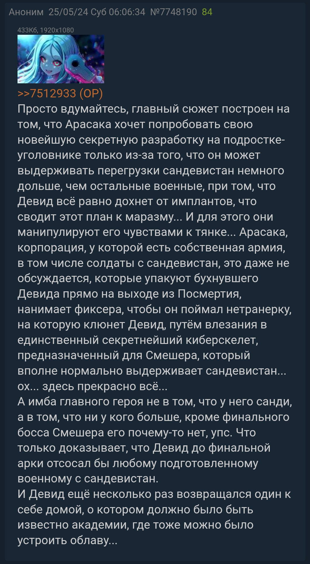 И это я ещë делаю скидку, что это аниме по механикам игры. То есть, где на живую без анестезии спокойно меняют блять позвоночник, где после сотни ударов и выстрелов обмажься зелёнкой и всë пройдёт, где подросток десятки раз за день использует сандевистан, от которого крышкой едут военные, нассав на механику самого тайтла. Да блять, я сходу могу придумать за авторов очевиднейшее объяснение - подросткам в силу пубертатарастущего организма проще выдерживать перегрузки по нескольку раз в день. Но нет, блять, Девид будет просто с нихуя избранным. Люси - ценнейший нетраннер арасаки - не имеет в своём теле их маячка и спокойно выбирается из ебанного бункера, будучи маленькой девочкой, ау, здравый смысл, ты где? Она же не диклониус в конце концов. И при этом всëм еë в финале полностью заблочил вообще левый фиксер с улицы. Милитех стоит и заботливо ждëт установки имбы, а в это время Киви успевает рассказать всë об импланте, от имени Люси успевают записать голосовуху, сама Люси успевает сбежать, и отправляет уже сама вторую голосовуху, еë догоняют и ловят... Чумбы, че вам зашло, я хз.