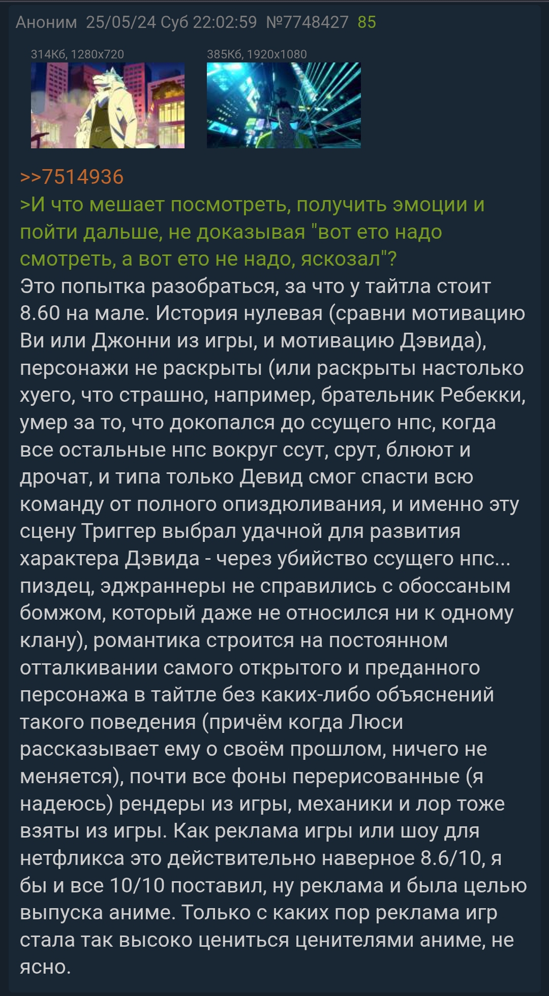 Если нам не нужно оценивать тайтл, то окей, очередная история любви в сеттинге игры киберпанк. Если мы начинаем оценивать тайтл, то простите, как не доколупываться до деталей? Как потом сравнивать с другими просмотренными произведениями? Ты щас буквально написал, что надо отключать мозг при просмотре лол, ну и иди нахуй с такой аргументацией тогда.