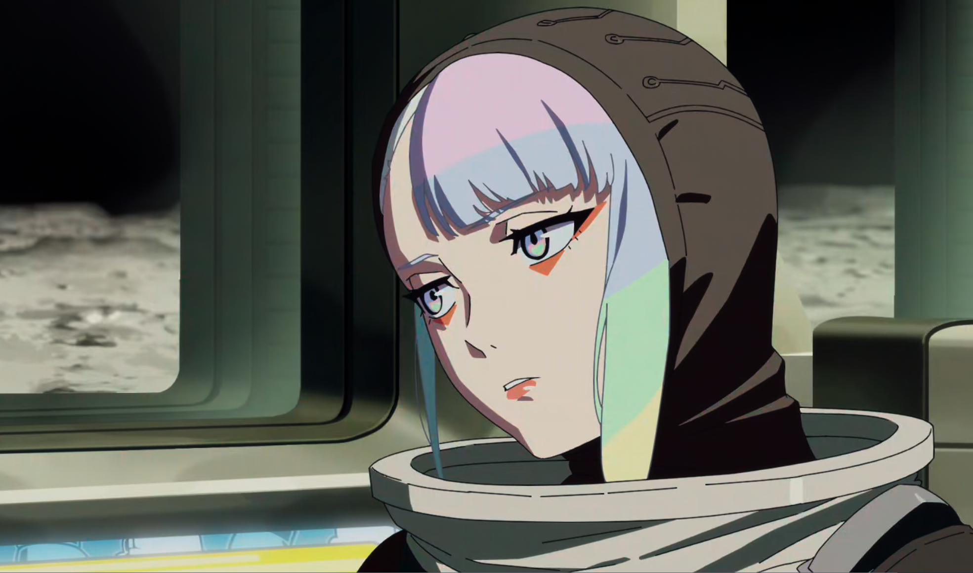 Но почему это сделано так плохо??? Где вообще кадры с запуском ракеты? Проебали ракету как символ полёта к Луне, хотя до этого несколько раз показывали на фоне. Вместо этого показали пролет какой-то сраной маршрутки. Почему нам не показали, как Фалько покупает ей билет за неë, как она бы сидела с отсутствующим взглядом до последнего, пока еë под ручки не повели бы к выходу на Луну? В аниме катастрофически не хватает сцен раскрытия персонажей, из-за чего оно смотрится ужасно плоско и рвано. Да, если бы она сняла шлем, увидев вновь радостного Девида без скафандра в своих воспоминаниях и забылась, что она не в симуляции с ним, это бы прибавило балл тайтлу, но только один балл.