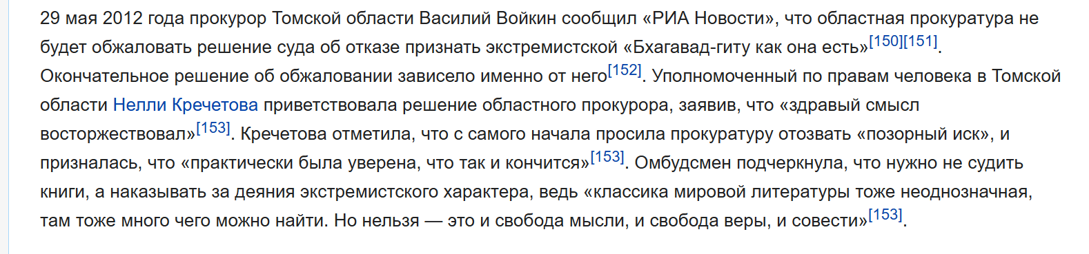 Запрещена книжка "Bhagavad-Gītā As It Is" от Общества сознания Кришны с ебанутыми комментариями. Оригинальная беседа тоже выглядит дико, это только в Википедии кришнаиты все красиво обрисовали, на самом деле там посыл - буквально быть рабом.
