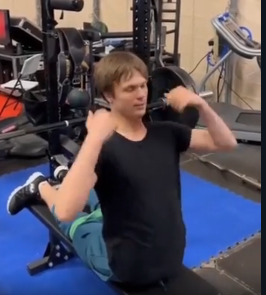 Недавно был видос где он приседать пробовал, при том что у него со спиной было не все в порядке, но вовремя остановился, слишком страшно стало. Когда искренне любишь всю вот эту фитнесс движуху и какие-то конкретные упражнения, то это нормально.