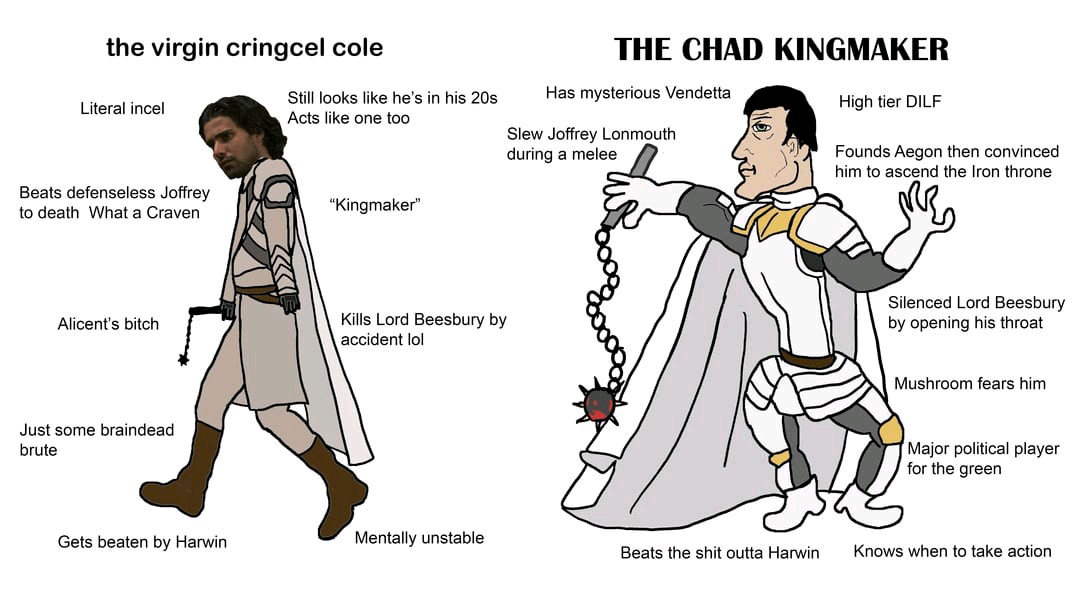 Ты видимо какой-то нитакусик? Или вообще просто залетный хуй какой-то, который сам не в курсе, что было в тех тредахПотому что я не помню особо такого нарратива в тронотредах. Помню как во первых весело друг друга засирали сторонники короля без члена и переваренной королевы, как обсуждалось скатывание сериала(обе стороны были согласны), и как перетирали за книжный лор. Из тех анонов, который типа нейтральны, был трубадур да еще парочка, но они не базовички против всех, которые всех типа засирали, а именно что нейтральными пытались быть, трубадур например регулярно персонажам обеих сторон свои аишные песни посвящал. Были аноны которым сериал вообще побоку был, только книги обсуждали, были аноны которым наоборот, были и специфические вроде висеньешиза. Но не то что ты пытаешься описывать кек.