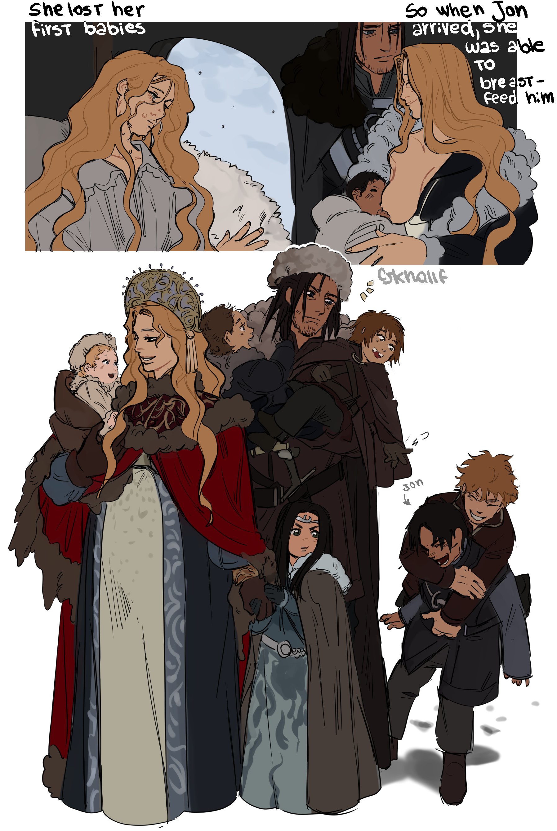 Ты преувеличиваешь. Собственно единственная опасность заключалась в том что Джон родился бы с таргариенскими волосами/глазами. За вычетом этого всё остальное это мелочи. Ну или авторская условность. Потому что Неда не то что по поводу формы ушей Джона не доебывают(чего и не должно быть), но даже и по поводу личности матери особо никто не лезет. Хотя королевский двор вполне могло заинтересовать, кто же смог забыть Неда Старка про честь. Роберт тоже вяло интересуется. А, ну Вилла и Вилла, хуй его знает, кто там и что там, похуй на подробности. Эшара там мля какая-то, похуй всем.