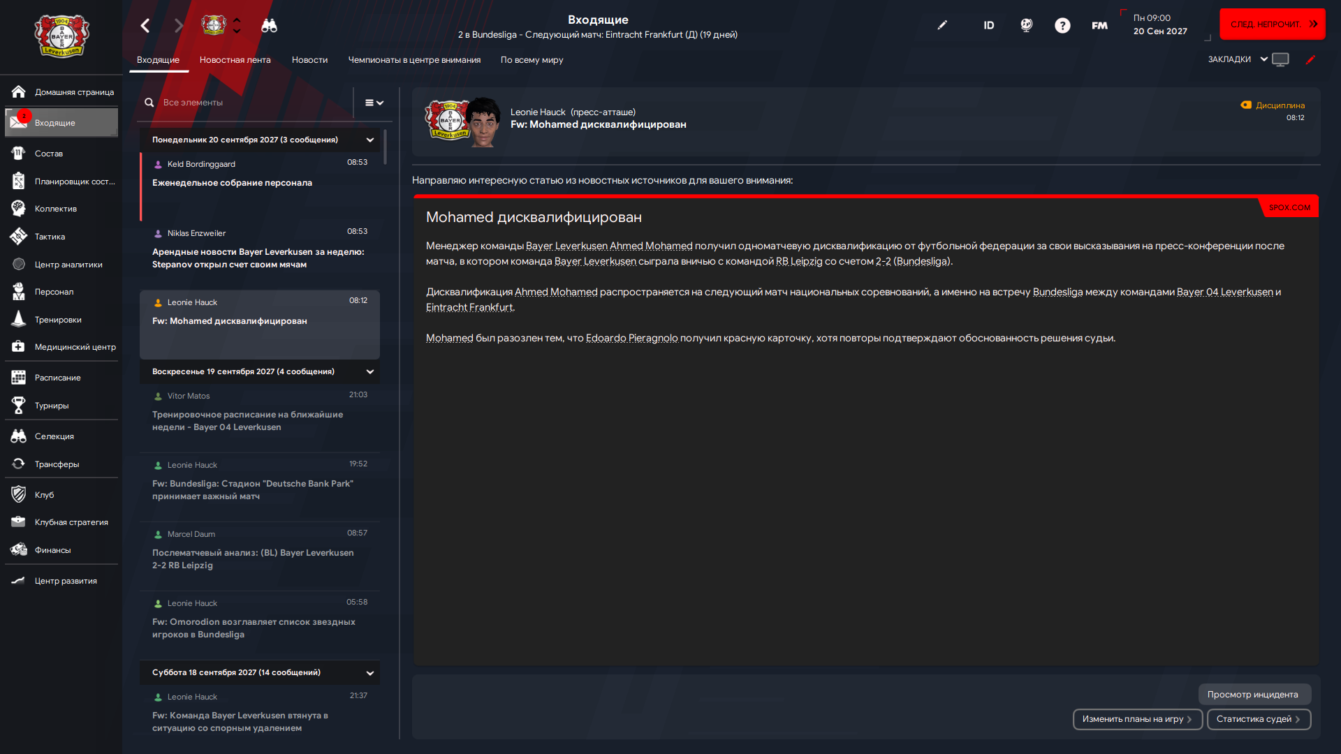 Идея заключалась в том, чтобы воспроизвести в игре процесс общения, характерный для футбола в реальном мире, но в Sports Interactive поняли, что в видеоигре это не сработает. В результате было принято решение переработать и улучшить старые системы обмена сообщениями, чтобы сохранить привычную атмосферу.