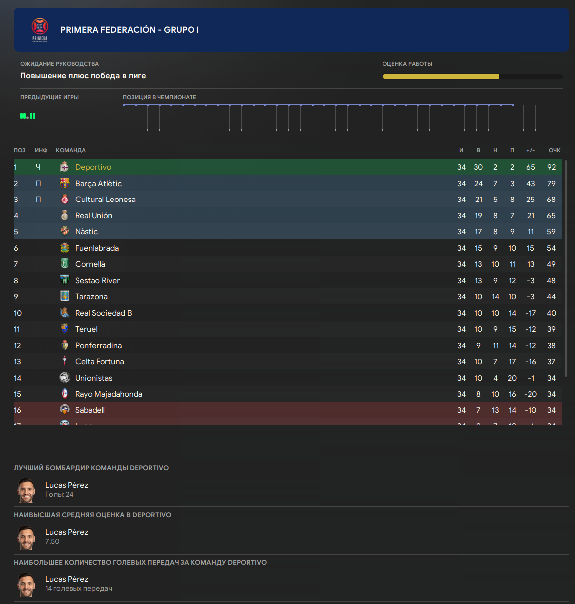 На разгребание этих авгиевых конюшен потребовался целый первый сезон, стабильности никакой не было, после двух-трёх удачных матчей вполне могли влететь залупе с 15 места таблицы просто потому что, плюсом ещё два игрока, которые откровенно рвали жопу, и тащили команду, поочередно в середине и ближе к концу сезона попросились на трансфер в Бельгию. Очень глупый поступок, но моим пацанам он стоил повышения в классе, концовку сезона те самые старые деды 31-34 лет провалили к хуям, безвольно слив важнейшие 6 матчей ничьими и поражениями, скатившись с комфортного 4-5 на девятое место.