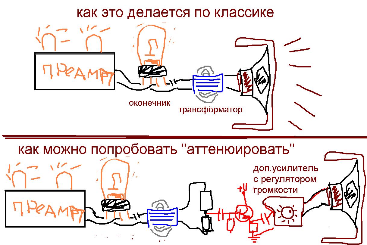 А то что ты пишешь про громкость и зависимость от него перегруза - совсем другое, относящееся не к преампам а к оконечнику. Там действительно нужно городить мудреную конструкцию чтобы было не громко но в то же время получить звук перегруженного оконечника. Для начала нужен сам оконечник, затем выходной трансформатор нагруженный на имитацию гитарного кабинета (чтобы нагрузка на лампу и транс была а звука не было), например на мощный резистор. И уже с этого резистора брать сигнал на делитель, буфер и дополнительный усилитель со своей ручкой громкости не влияющей на характер перегруза. Нарисовал как это должно быть на третьей пикче.