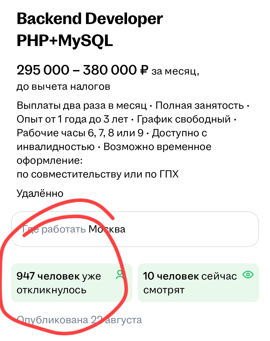Да нахуя ботить? сотни тыщ ищут работу. Выложил норм вакансию — вайтишники с тра проснулись открыли HH — о, норм вакансия. надо написать. Да, есть люди, которые имеют несколько резюме и спамят с разных акков, но они же тут ноют "я даже с фейковыми акками не могу пробиться на собес".
