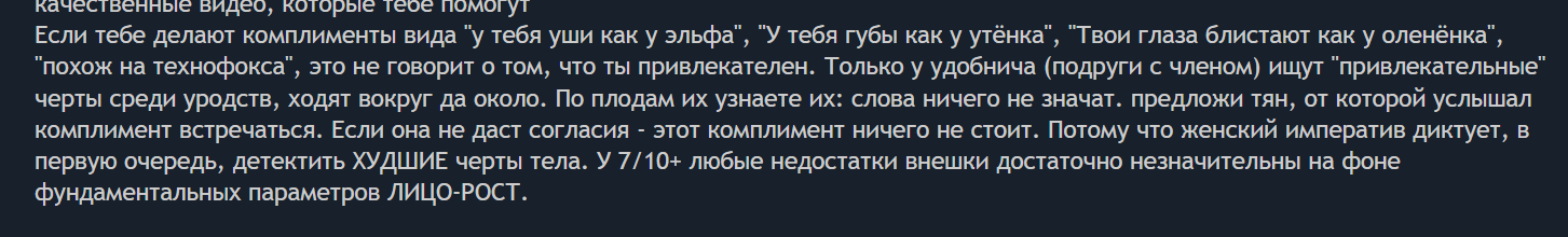 Вся вот эта хуйня "мужчина должен быть лидером" и "непрогибаться под женщину иначе она внезависимости от своих убеждений станет считать тебя за тряпку и уйдет". Вместо этого додики реально примитивные вещи выдают за базовые