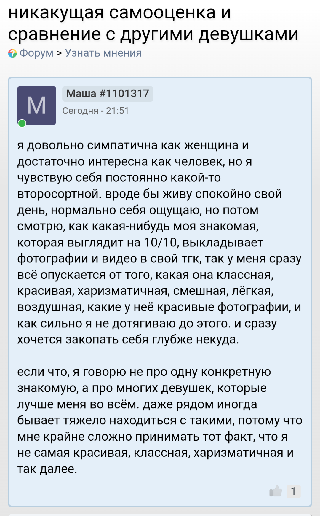 Забавно что в /деве или вообще любом женском форуме такой хуеты бабы и близко не пишут. Я даже не слышал нечто похожего на "научилась готовить, надеюсь будущий парень оценит".
