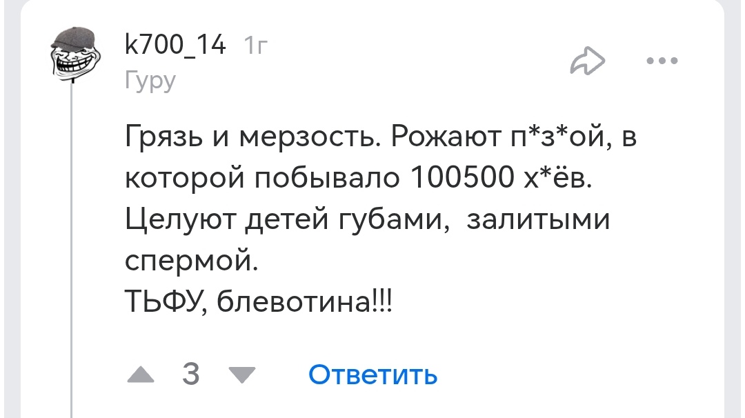 Я не говорил нормисы лучше или хуже меня, меня заебали советы от изимодного нормиговна типо вот я в 27 лет поебался с 42 летней азазаза сасайте чмошки, смотрите узбечек, рсп которая не будет тебя любить и ты ее.конечно для тебя нормиговна женщина это кожа вокруг пизды, ты хочешь ей в уши нассать хуйни чтобы она сняла трусы и все твоя миссия завершится, а то что ей 42 года и она слушает Стаса михайлова и ей было 25 и она уже рожала когда ты ходил в школу и играл в компик после уроков это конечно похуй