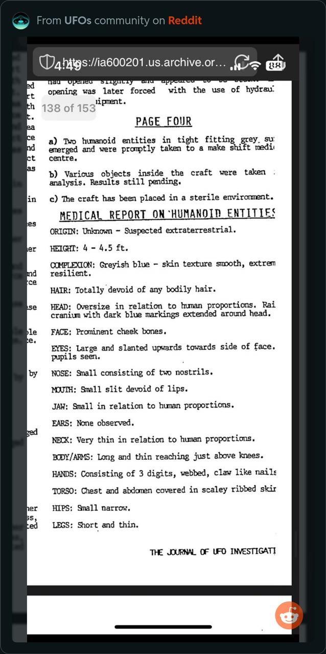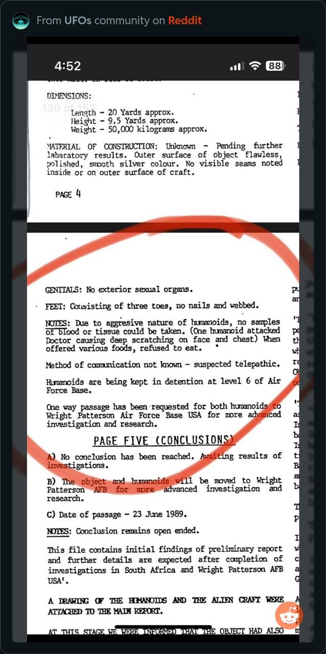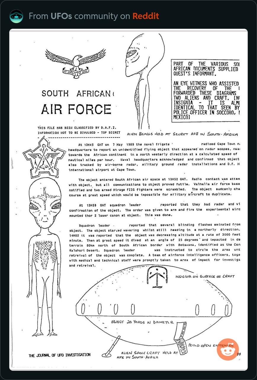 Это было фальшивкой, доказанной полностью на старом форуме AboveTopSecret. Фантастический форум, где собирались агенты и обычные люди. На этом сайте было развенчано множество фальшивок, и его закрыли 3–4 года назад. Сейчас вы видите, как те же самые вещи снова циркулируют — Serpo, Lacerta, SkinnyBob и так далее. Это американские психологические операции, разжигающие старые фальшивки, потому что Google теперь ужасен и вы не можете найти ничего, кроме рекламы. Но по сути, это была фальшивка; дальнейшее чтение из моей базы данных пишет следующее From George Eberhart's UFOs and Intelligence: A Timeline (at CUFOS): 1989, May 7 — Hoaxed South African Air Force documents purport to describe a UFO crash in the Kalahari Desert in Botswana 50 miles north of the South African border. Two Mirage fighter aircraft allegedly pursue a fast-moving UFO and shoot it down with an experimental “thor 2 laser cannon.” However, UFO researcher Cynthia Hind notices ludicrous errors in the documents, not least among them that they are in English, not Afrikaans. (Wikipedia, “UFO sightings in South Africa”; “UFO Crash on Botswana/South African Border (Case no. 21),” UFO Afrinews, no. 3 (May 1990): 5–13; Cynthia Hind, “Further Report on the Alleged Botswana/South African UFO Border Crash: Case no. 21,” UFO Afrinews, no. 4 (March 1991): 20–24; “Almost Final Report on the Botswana/South African Alleged UFO Crash,” UFO Afrinews, no. 5 (January 1992); 29–35; Cynthia Hind, “Anatomy of a Hoax: The UFO Crash on the South African/Botswana Border,” UFO Times, no. 23 (May/June 1993): 15–18; Clark III 1096–1098)