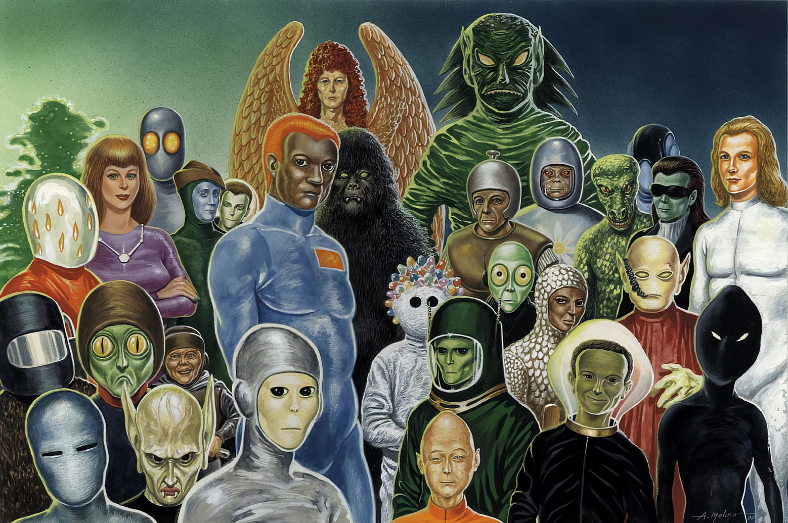 В одном относительно свежем сериале, название не помню, человечество сильно апнулось в развитии, жили на марсе, на астеройдах, космос покоряли. И в итоге нашли древний портал, который привел их на планету, там они нашли жизнь, ну как жизнь - облако птичек-жуков, которые пролетая резали всех за счет своих острых форм. Выглядели эти жуки что-то вроде острого треугольника-многогранника, потом внутри планеты еще такое же существо объявилось, полностью другой неизвестный химический состав, то ли кристалл, то ли металл, еще и меняет форму, но живой и очень разумный.