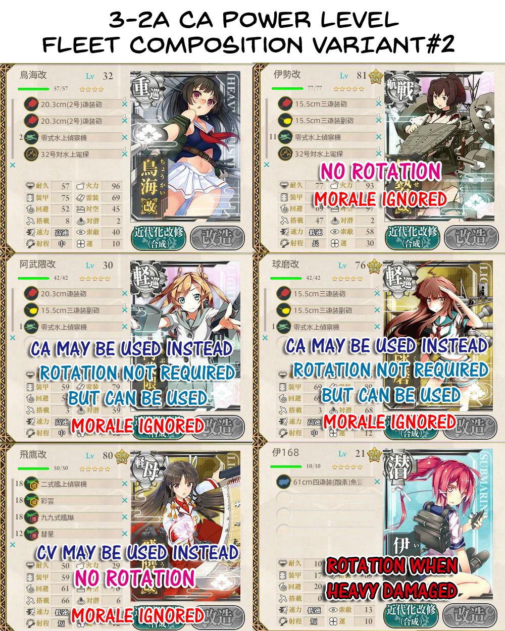 Пройди 3-1 кэрриерами и ББ и забей. 3-2А твой любимый нод на ближайшие дни, если не недели. Кроме того, у тебя уже открыт ещё и четвертый мир и ты можешь попытаться через несколько дней пройти до 4-3, чтобы качать дестроеры и легкие крейсеры с нормальной скоростью. Из больших кораблей хорошо бы прокачать до кай хотя бы 2-3 из Конго-класса и потом засесть за крейсеры, конкретно за Хагуро и Мёко. Конго качать до Кай Ни пока не нужно - во-первых, это очень долго, во-вторых стоит немеряно ресурсов. Из ДД лучше всего первыми прокачать Юдачи и Шигурэ, из легких крейсеров - весь Сендай-класс.