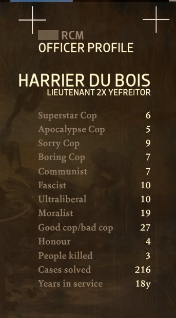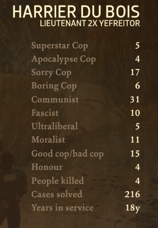 Меня в своё время очень впечатлил этот квест с кораблём, реально для норм развязки нужно пропылесосить всю игру и раскрыть все тайны Мартинеза чтоб прокачаться и было что полезного передать в финале, даже Трибунал не приговор для квеста в отличии от других идеологий, плюс реально сложная диллема с Кимом, музыка прям отличающаяся по настроению от всех прочих суперпечальненьких, загадочность по ходу финала нарастающая от помех на немецком выкрутасов Гарри с внутренней империей и таинственных доёбов Трепета. Ну и собственно главное меню после концовки вместо титров с этой музыкой, как добивочная к тому ощущению что Гарри бросил город. Но кто этот город блять только не бросал, сорокалетный пулутруп убивший на защиту города большую часть жизни заслуживает сдохнуть в нём же под мостом? Или всё же лучше сдохнуть в правительственных застенках?