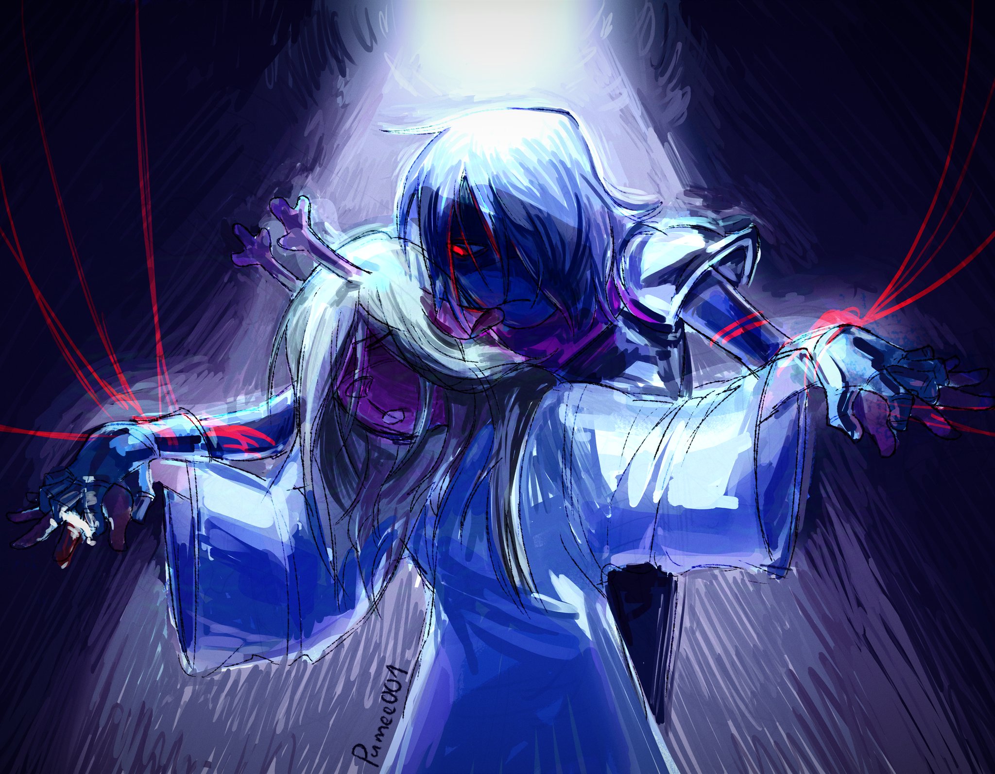 Во время боя он держит меч в левой руке. В конце 4 главы создает тёмный фонтан держа меч в левой и так само пуляя их вниз левой. Слишком часто он именно ее и использует.