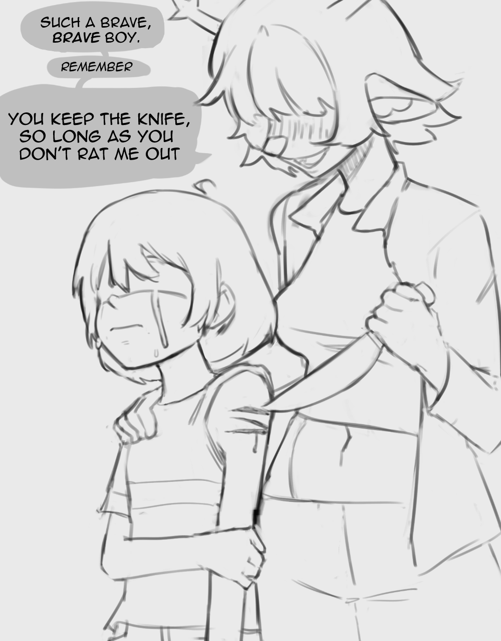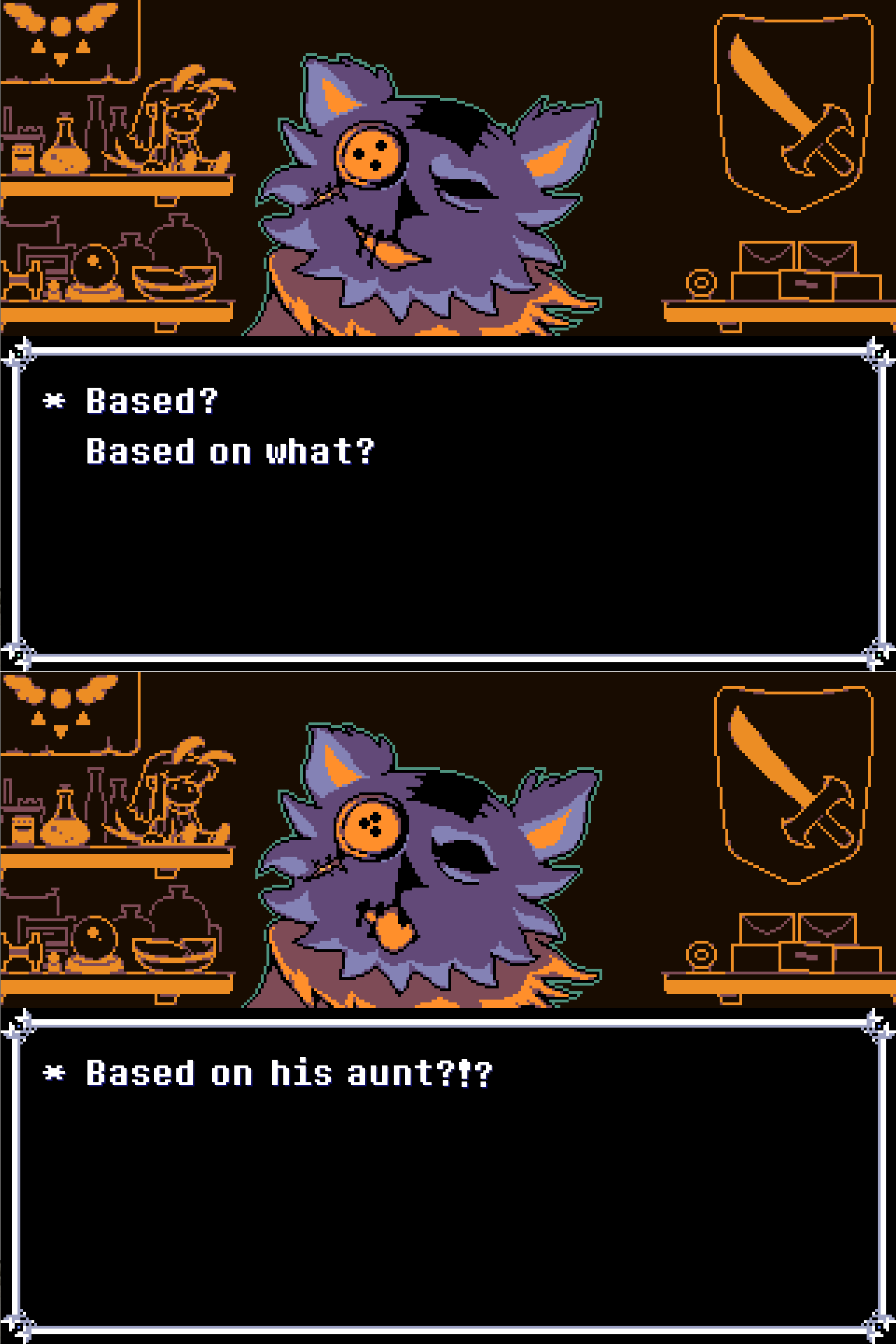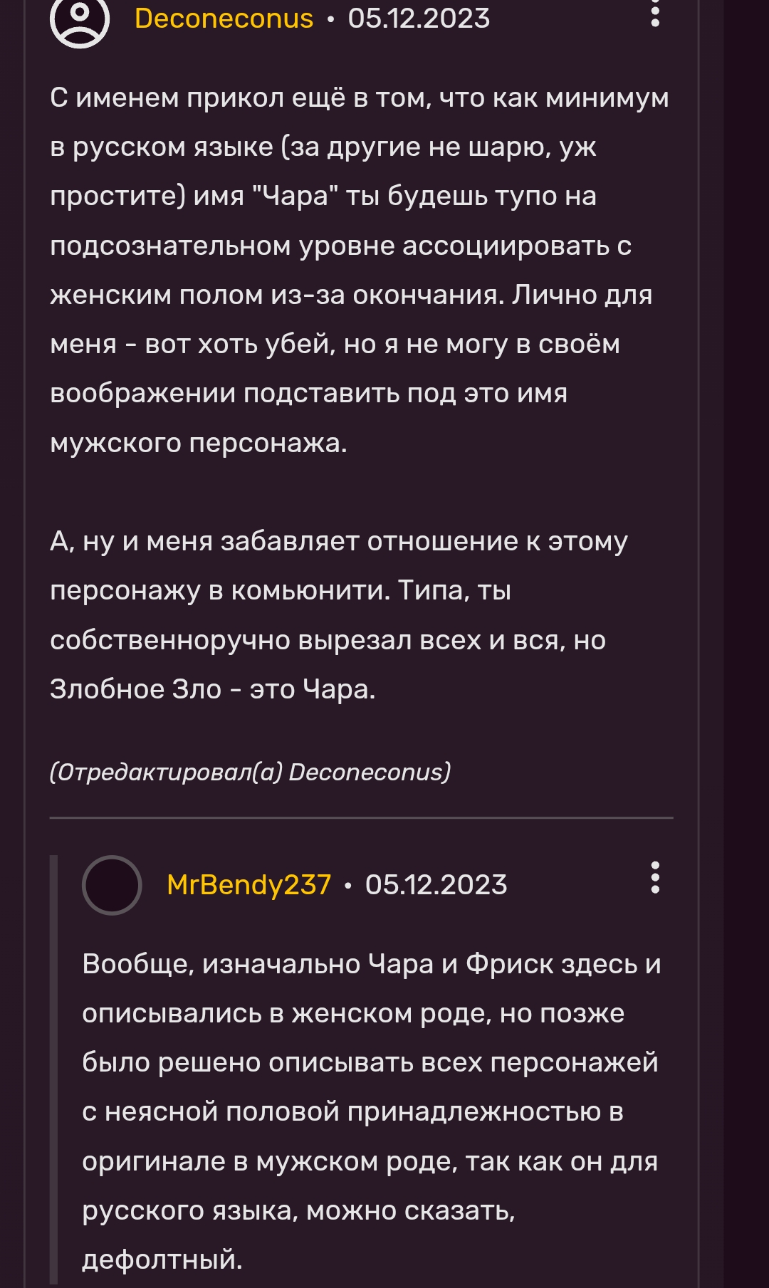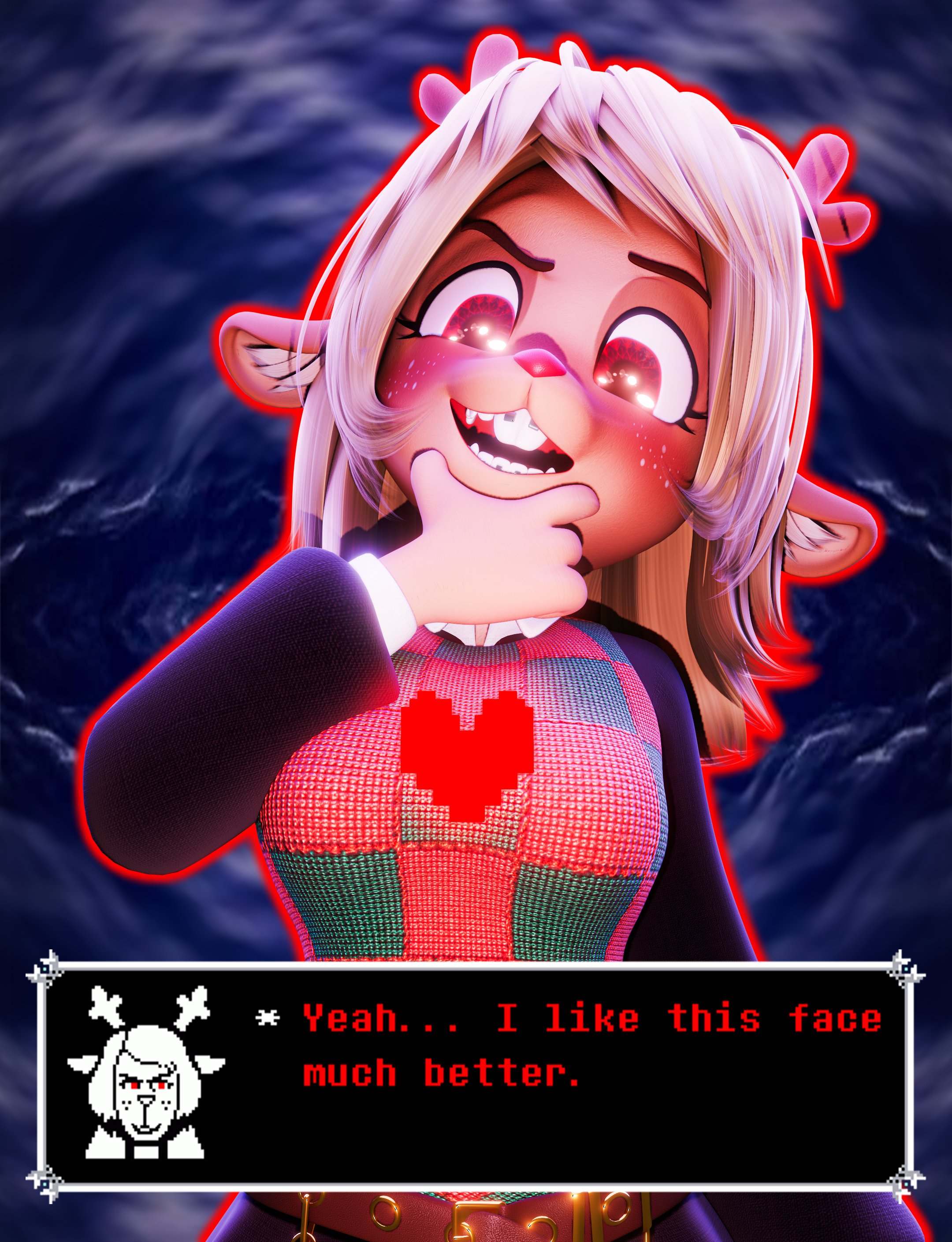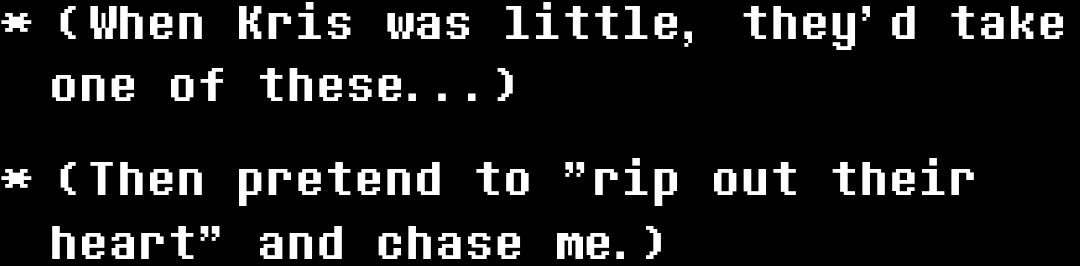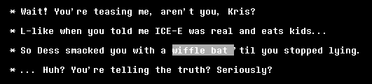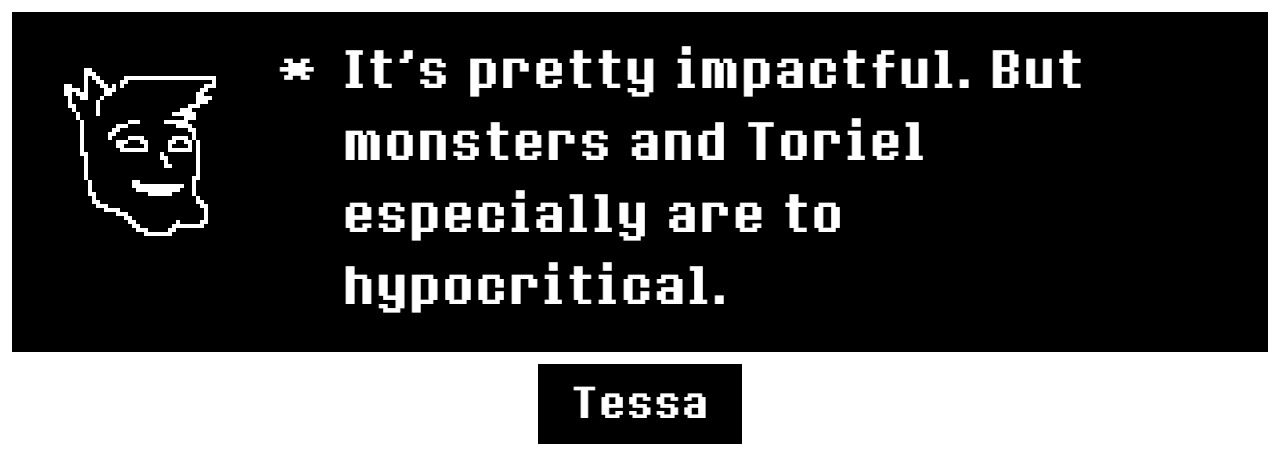 Тут надо отметить, что когда я говорю про "конкретность", это очень зыбкий аргумент на самом деле. Потому что в самих репликах никакой конкретики нет. Но вот именно "ВАЙБ" некоей направленности присутствует, но, опять-таки, зыбко. А ещё во мне говорит непреодолимое желание привязать Чару к нарративу Дельтарун, чтобы её диалоги из UT и отсылки к геноциду на сноугрэйве имели хотя бы толику ебаного смысла.