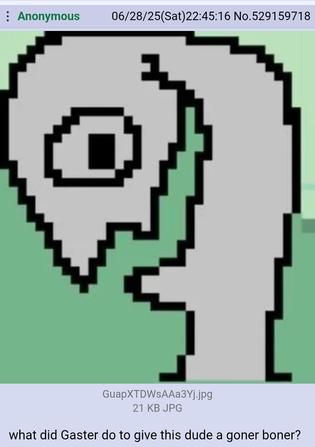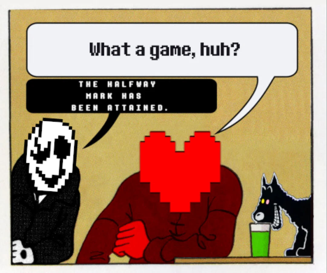 Да, согласен полностью. Это кстати не единственный намёк на Гастера в Трулабе. У МемориХедов 6 пробелов в имени, при первом действии. Запись 17 вообще говорит сама за себя (непонятно, правда, где запись 17 за авторством Альфис. Можно конечно предположить, что она просто пропустила один номер на стрессе, но это как-то скучно. Тем более, что в ранних версиях игры такая запись была). У SockMuppet вообще был гига-видос на эту тему, мол на самом деле часть записей написал Гастер. Видос прикольный, прям классный, но идея мне особо не нравится. В конце концов музыка трулабы это ремикс темы Альфис. А ещё там в тумане стоит яйцечел. Вот от этого я охуел когда узнал