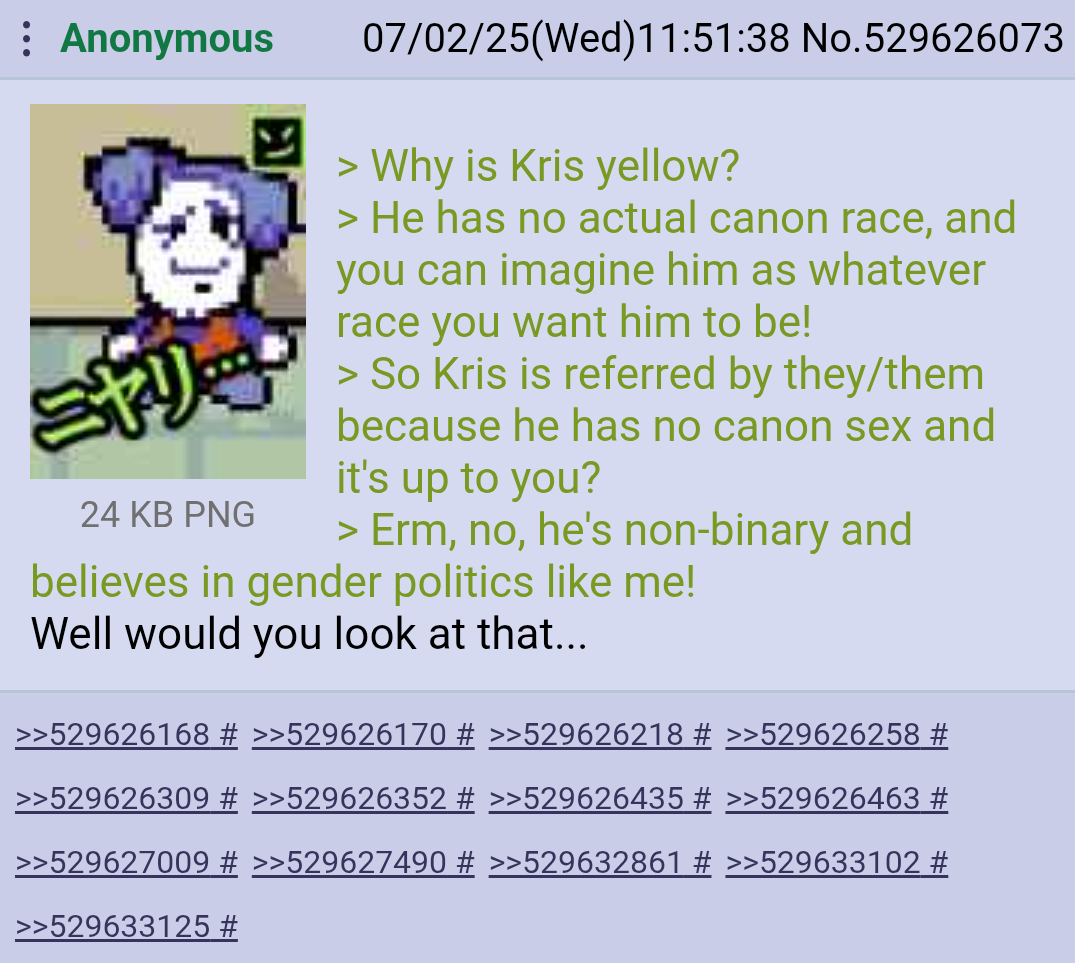 Не смотрел даже, но и не хочу. Когда то смотрел ее факты о андертейле. Ну прикольно, а так в целом я бы не сказал что она что то прорывное делает. Вот чел на ютубе half bread чет там очень охуенные разборы делал, но он англо язычный естественно. А эта Тришка это такое вот. Просто контент на раз. Ничего серьезного там нет. К тому же, какой нахуй конфликт между андертейлом и дельтаруном? Если такое и есть, то только среди ебнутых шизов. Никакой нормальный фанат не будет ненавидеть дельтарун или наоборот. Это бред. Так что чё она там выбирает никого не ебет. По любому будет чисто синдром утки и всё. Но я посмотрю его чуть позже. И напишу чё думаю.