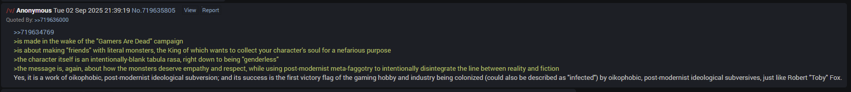 Я с этим даже по ряду примеров не спорил. Другой анон вполне внятно объяснил почему не согласен. А главное ни я не он не считаем, что это лучшие элементы игры. Ни он, ни я не говорим: "как же классно и охуенно, что тут есть лесбухи и пидоры" Так что нахуя ты тут усераешься — непонятно. Какой-то абсурд. Тебе с твоими тейками лучше никуда не идти надо на условный реддит, борец ты наш с соей
