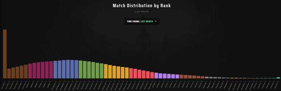 Пойми, что огромное количество акков будет на лоу рангах просто, потому что их забрасывают. Вот поиграл тип в игру, апнул низкий ранг и ушёл, акк остался и идёт в стату. Логика в том, что на низких рангах акки залетевших и не осиливших и их очевидно будет больше чем обычных игроков. Особенно эта логика хороша применима к Дедлоку где есть только ранкед.