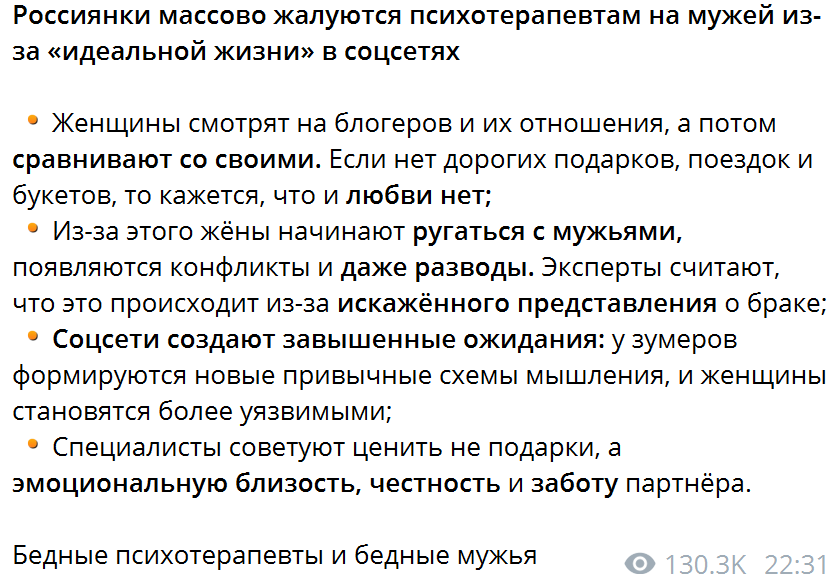 Да кому они нужны. Он сам же говорит, что его смотрят такие же разведённые скуфы за 40, которые ещё ему в комментах поддакивают "я 20 лет с ней жил, а она даже последний спиннинг и блёсна забрала!"