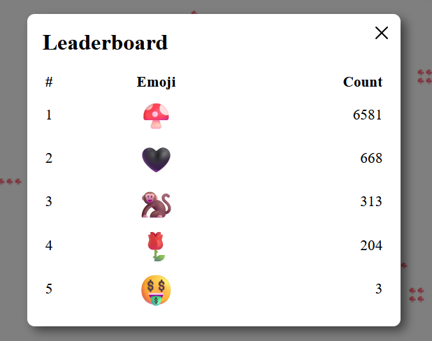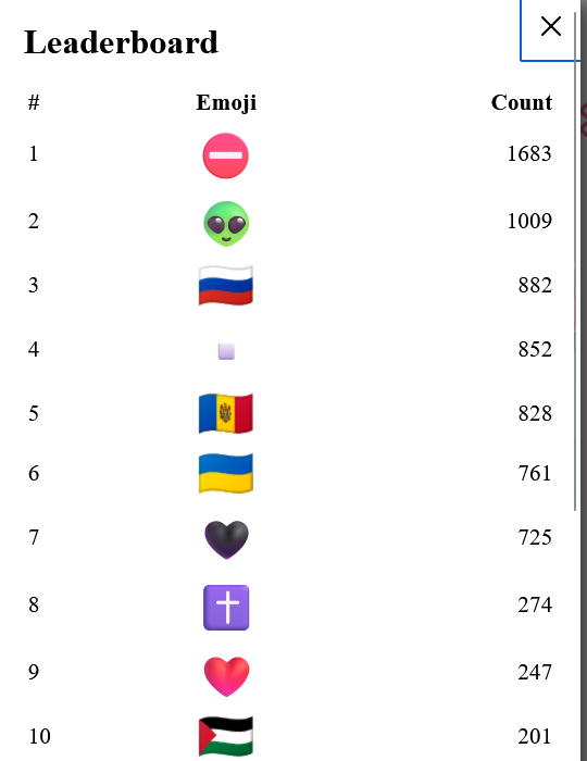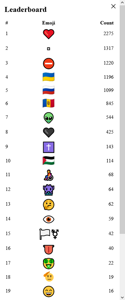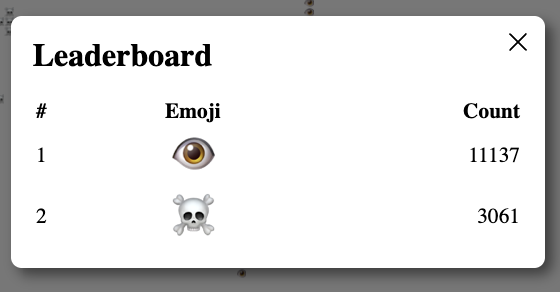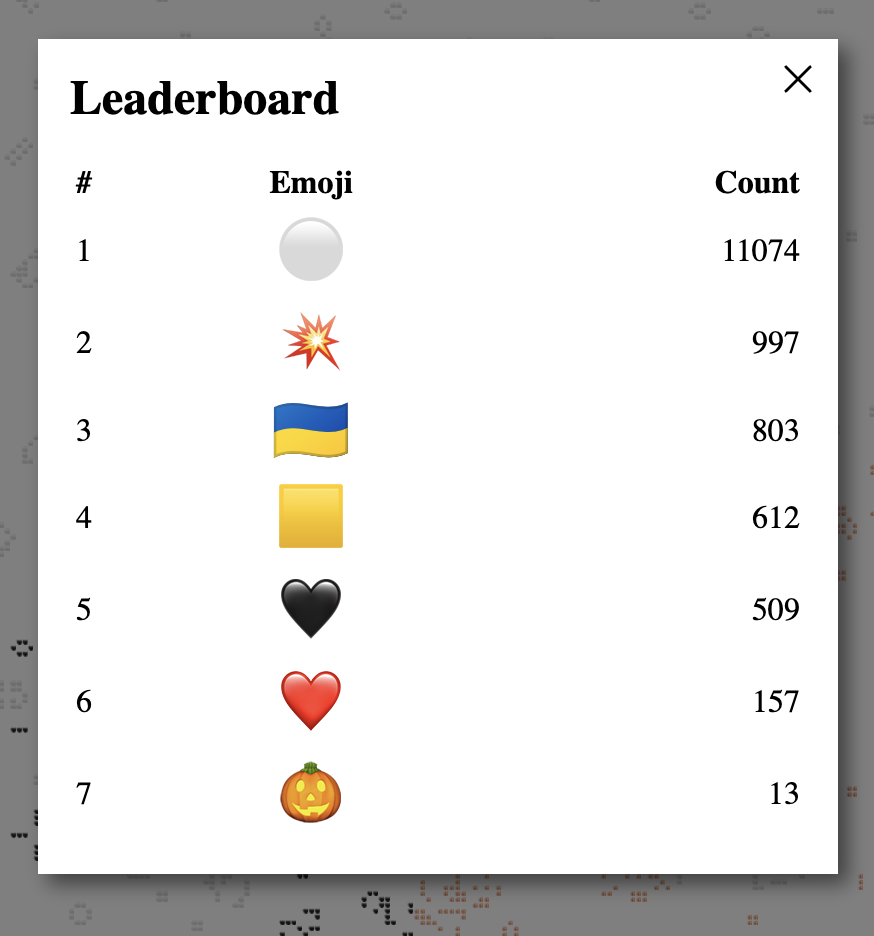 Есть статистика по количеству живых эмодзи на всей доске и отдельно в центре - открывается по кликам по соответствующим верхним углам страницы.