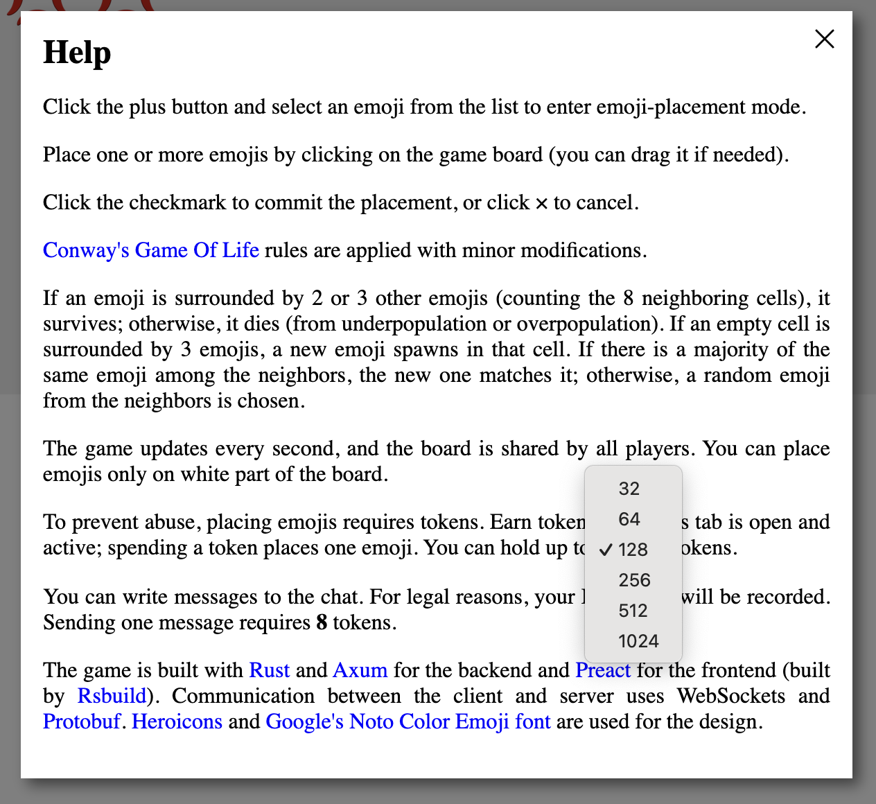 Игроки ставят эмоджи на онлайн доске, а игра каждую секунду проводит симуляцию. Если у эмоджи меньше 2 соседей он умирает от одиночества, если больше 3 - от перенаселения. Если вокруг пустой клетки ровно 3 змоджи, то в ней тоже спаунится эмоджи (определяется по большинству соседей).