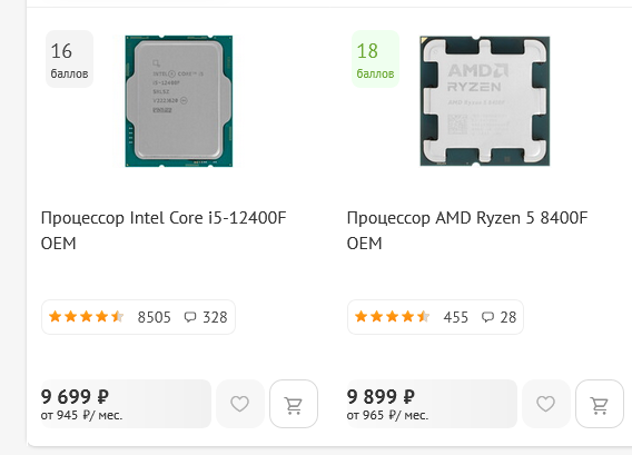 2. 12100f, авито, проц 3к + мать 3.5-4к + память 1-1.5к итого ~8к. С той же логикой, что и у 10400ф, но платформа с большим уклоном в синглкор.