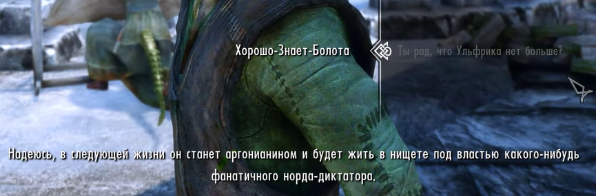 Скайрим - это тебе не хуй собачий, а страна с обычаями. Империя не имеет права вмешиваться в выборы верховного короля, и если ярлы выбирают Ульфрика, то надо признать Ульфрика. Империя не должна указывать нордам как им жить. А говорить что "надо сплотиться с охуевшей империей потому что Талмор" это как говорить американскому борцу за независимость что "надо сплотиться с короной потому что Наполеон"