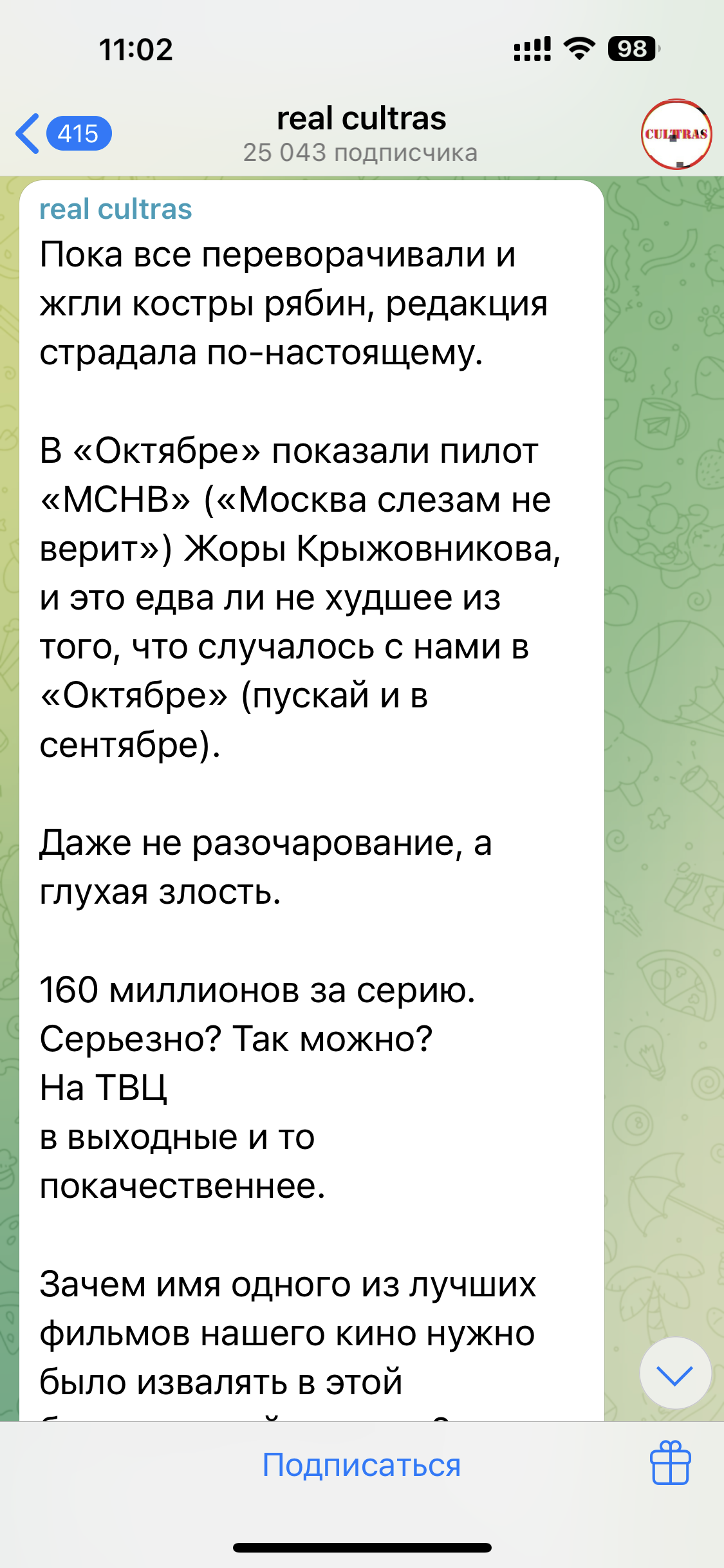 Это ни о чём не говорит. Даже о проплаченности того, кто это поставил на аватарку канала. Может быть, ему реально понравилось, может быть, не хочет портить отношения с коллегами, с которыми ему ещё работать, может ещё что-то. Лично мне ещё по трейлеру стало понятно, что смотреть это не стоит. Как и в целом необоснованный кредит доверия к жоре, который основан только на успехе его чушпанов.